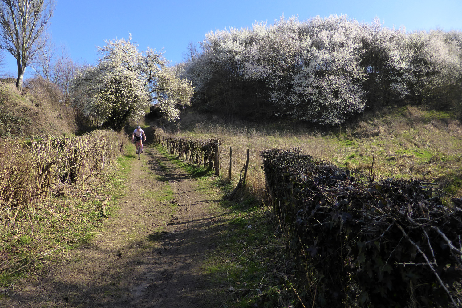 Ons bijna verslapen, zouden om half negen ontbijten en werden pas om kwart over acht wakker. De spierpijn begint nu ook toe te slaan, eerst even wat oefeningen doen om ze los te maken en het helpt. We gaan op pad voor het laatste stukje. Het moet een makkie worden, slechts 11 km naar Valkenburg, dat is gelijk de eerste stop, onderweg geen koffie. We zien massa’s kraanvogels overvliegen die op weg zijn naar Siberië. een prachtig gezicht.In het veld boven op het plateau leeuwerikken, wat een energie moet dat vliegen toch kosten voor die vogels, de vleugeltjes gaan zo snel op en neer.In een boom een appelvinkje.