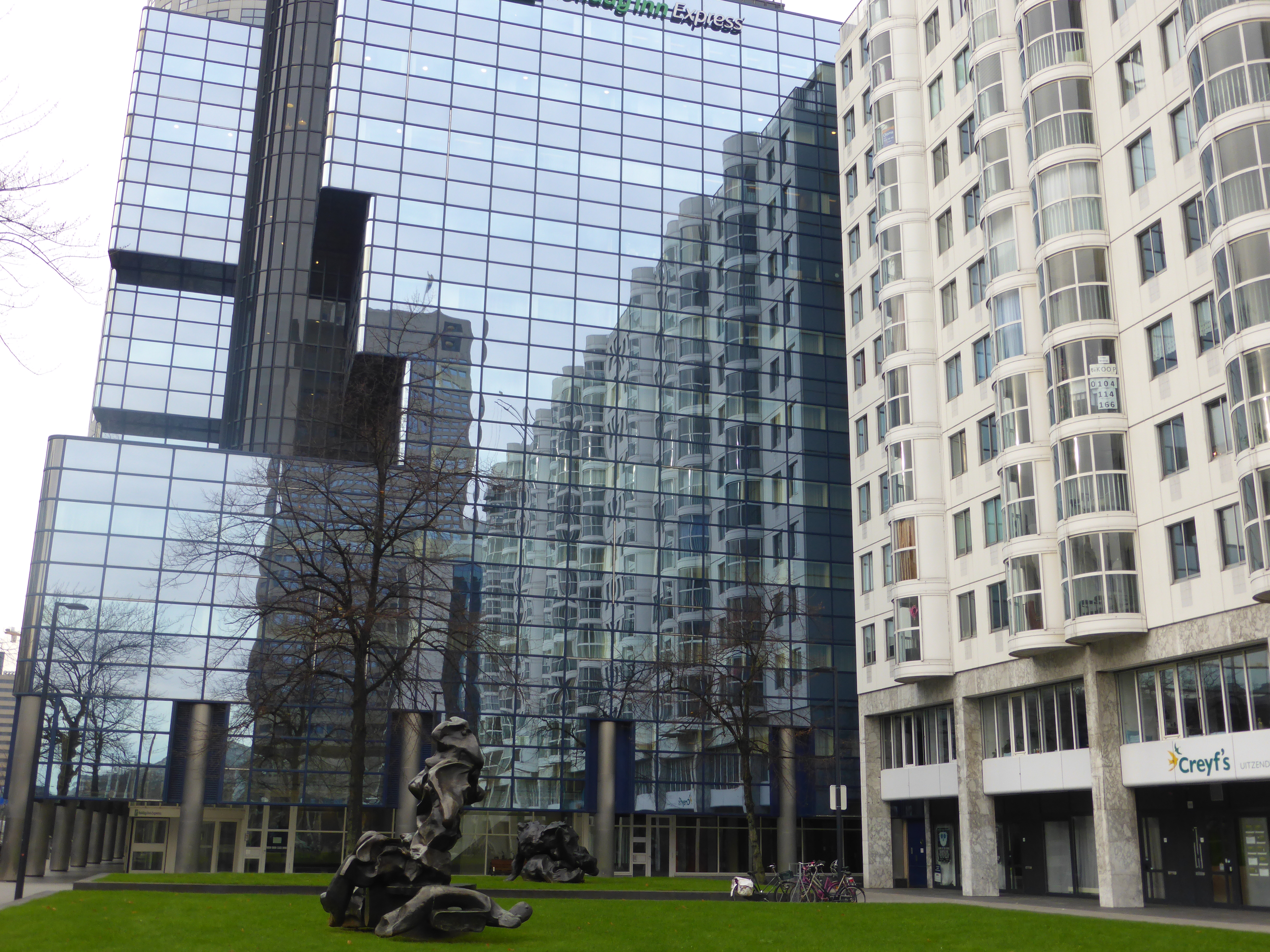 In Rotterdam aangekomen nemen we de achteruitgang van het nieuwe station en lopen we langs allerlei herinnerings plekken van mijn geliefde. Aan deze kant van het spoor zie je nog niet de gigantische gebouwen waar Rotterdam nu mee vol staat. Op het Weena staan mooie beelden en glazen gebouwen waar het hele plein zich in weerspiegeld.