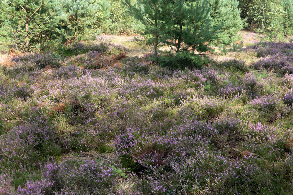 Vochtig dus en daar loop je dan met je nog maagdelijke schoenen. In het begin probeer je nog uit te wijken maar dat lukt echt niet. Dan komt het kleine jongetje weer boven en ga ik er vol doorheen, heerlijk soppen en mijn schoenen hebben gelijk een mooie doop gehad. Wat blijkt, ze zijn waterbestendig, ik hou droge sokken. Het pad wordt steeds smaller en de brandnetels bloeien hier weelderig. Met mijn korte broek aan is het moeilijk om ze te ontwijken. Gelukkig heb ik mijn poles bij mij en de meeste brandnetels sla ik weg, maar helaas niet alles, het prikt lekker. Maar ook hieraan komt een eind en ik kom in een van mijn favoriete gebieden, het Leersumse veld. Mensen wat is dat toch een mooi gebied. Het heeft alles, water, heide, bos, open velden, schapen, runderen en vooral veel vogels.