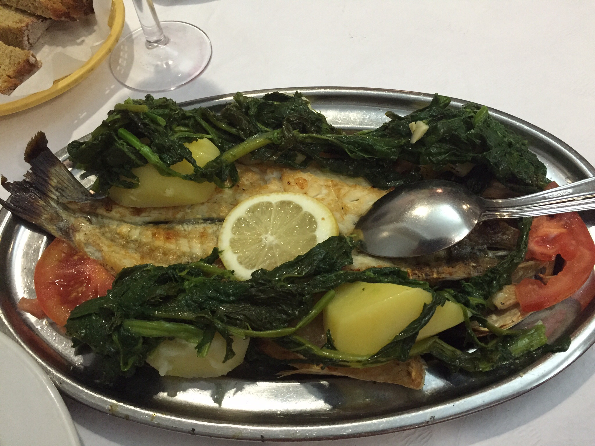 Ze grillen de vis op echte houtskoolvuren. Heerlijk. Ik ben niet zo van de witte wijn dus ik denk rood kan ook wel. Vino tinto. Je hebt wel eens de keus van, je glas is half leeg of half vol. Nou dat dilemma heb je hier niet, gevuld tot de rand. Ik denk nog even,  ik tuin erin, gelijk een duur avondje. Nee dus dat super grote glas gevuld met heerlijke, ook dat nog, rode wijn kost het lieve bedrag van………een euro. En dan die Robalo, dat is gegrilde zeebaars. Niks gekweekt maar zo vers uit de zee. Verwennen dus. Kopje koffie na, een pingo, dat is de Portugese cortado. Niet schrikken, vijftig cent.