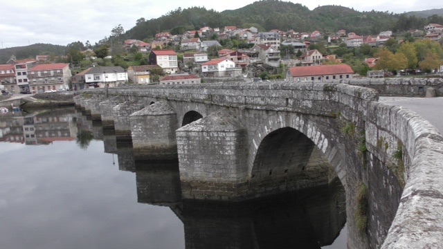 lopen langs kleine huisjes met in de tuin allemaal druivenstokken. Als er druiven aan zitten zijn het hele kleine in mooie trosjes. De eerste koffie stop is in Arcade waar we over een oude Romeinse brug lopen.