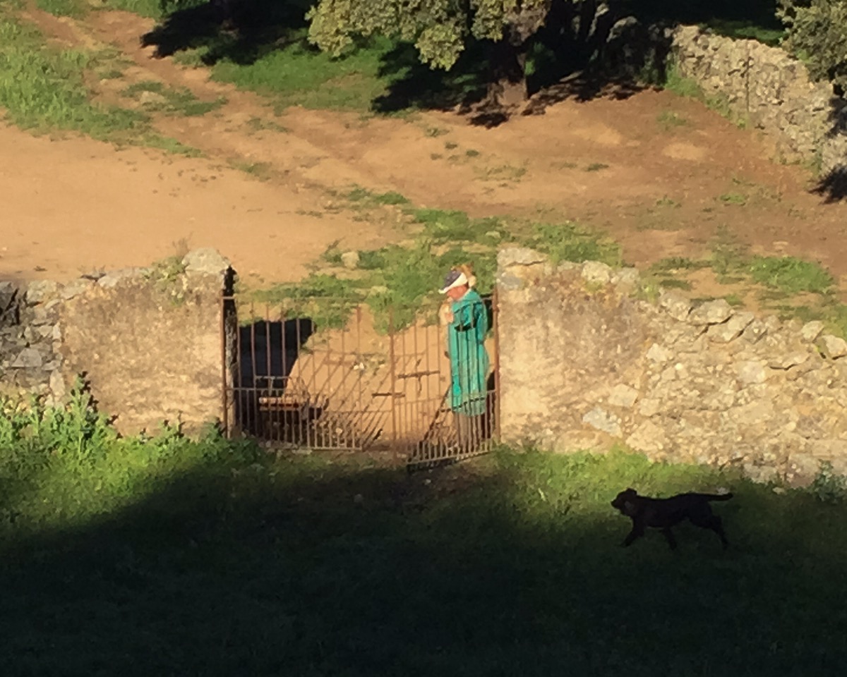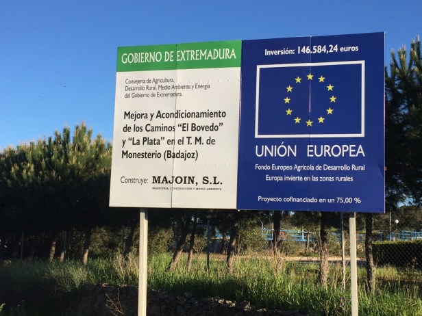 Monesterio is nog in diepe rust als ik iets na achten op pad ga. Dat is ook niet zo verwonderlijk, het zaterdagavond gebeuren ging tot ver na middernacht door. Veel drank , gezang, gepraat op de Spaanse manier en dat is niet zacht. Als de bebouwde kom ophoudt sla ik linksaf een pad in. Het is een kronkelige verharde zandweg. De meeste pelgrims zijn al onderweg, de mensen op de kamer naast mij stonden om vijf uur al te douchen. Die lopen het eerste stuk in het donker en dat is jammer want zeker in deze tijd van het jaar is er veel te genieten. Het enige dat ik hoor is het geknor van varkens, blaten van schapen, gemekker van geiten en een oude hond die schor blaft.