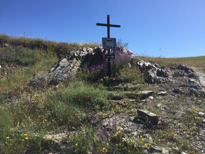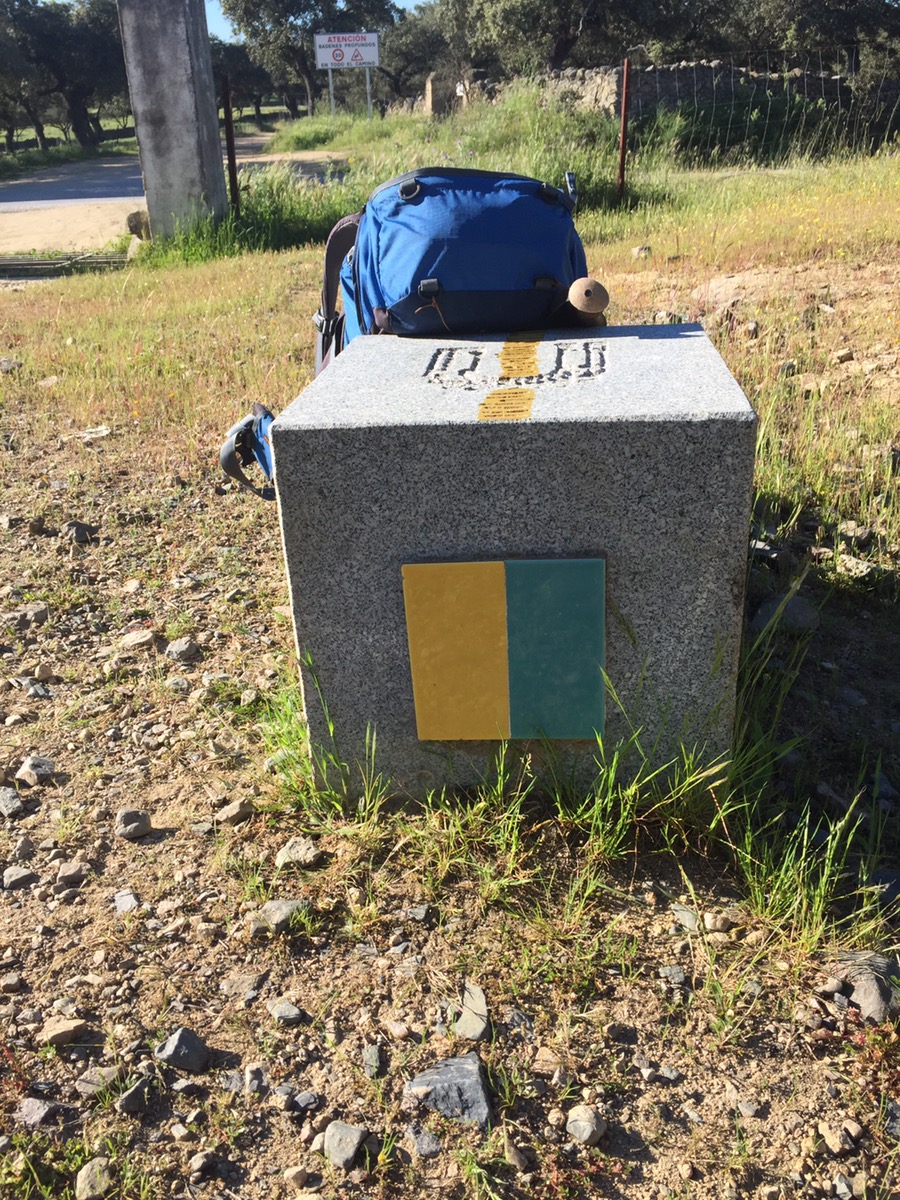 Regelmatig zie ik een muurtje langs de kant staan met daarop twee kleuren tekens. Een geel en een blauw/groen. Dat zijn twee camino´s, de gele is de Camino de Santiago en de ander de Camino Romano die over oude Romijnse wegen gaat. Maar hier loop je ze dus samen. Deze wegen zijn meer dan 2000 jaar oud. Stel je dat eens voor hoe dat is ontstaan. Ik zie het voor mij dat het legioen hier over de net door slaven aangelegde weg marcheerden om nieuwe gebieden te veroveren.