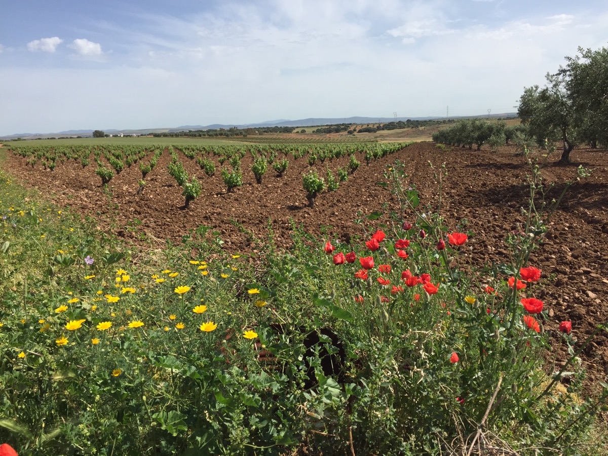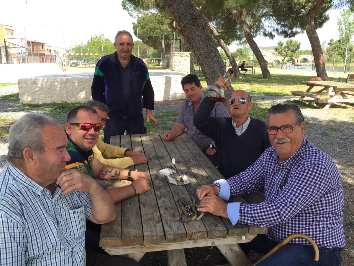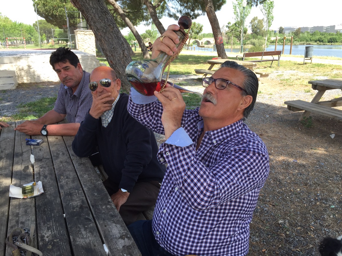 En dan is daar opeens in de verte de beroemde Romaanse brug van Merida. Ik zie wat picknick tafels en ga het er eens lekker van nemen met een oud broodje en een heerlijke sinaasappel. Naast mij aan een andere tafel lijkt het wel een hangplek voor ouderen, weer alleen mannen. Ze drinken om beurten door uit een speciale fles zo het edele vocht in de mond te laten lopen. Ik moet natuurlijk ook meedoen, pittig wijntje.