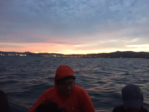 Het is nog donker als de boot met een rotgang het ruime sop kiest. Een aantal andere pelgrims zijn volledig waterdicht ingepakt. Wij dus niet. We zitten op de rand van de rubberboot,het water spat er overheen en mijn net voor de eerste keer gewassen kleren zijn weer net zo zout als ervoor. Maar wat een sensatie. De opkomende zon en scheren over het water.