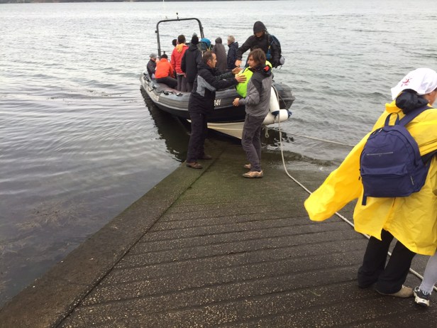 We liggen goed op koers en dan een klap. De moter valt stil en daar dobberen we. Toch een beetje het gevoel van wat die vluchtelingen moeten meemaken. Wij dan maar met 20 in dat bootje zonder zwemvesten aan. Er vaart een andere snelle boot langs en wij allemaal uitbundig roepen. Hij draait langszij. Het zijn twee stoere mannen die op weg zijn naar hun mossel platform. We worden op sleeptouw genomen en aan de wal afgezet. Het is koud en proberen warm te worden met zang en dans.