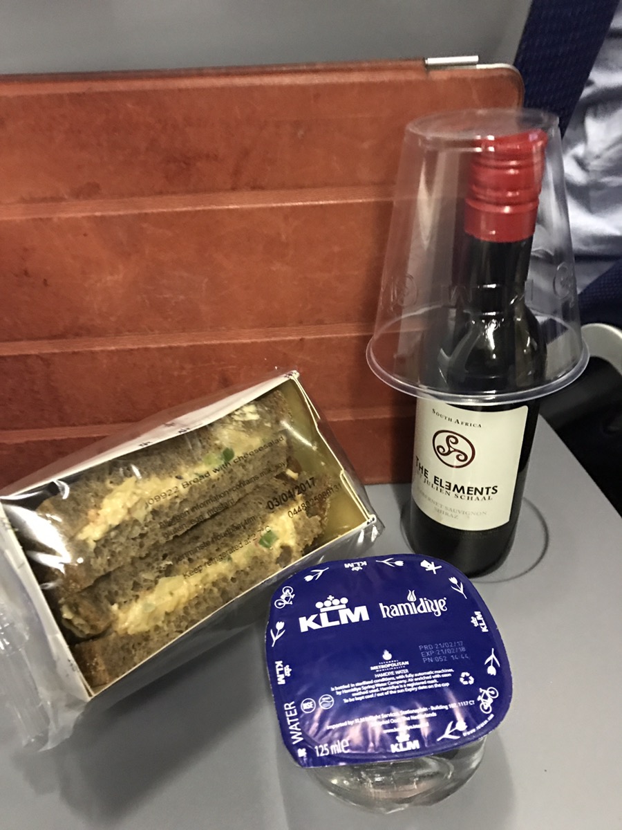 Op de heenweg kregen we alleen een plakje cake en een bekertje koffie maar nu twee heerlijke bruine boterhammen met Hollandse kaassmeuri, water en een flesje wijn. Wat een verwennerij. De baby is inmiddels in slaap gevallen, ik zit lekker te schrijven met een glaasje erbij dus wat wil een mens nog meer, ja snel naar mijn lief. We zijn inmiddels weer aan het dalen, mijn oren zitten weer dicht. Het was een prettige vlucht met onze nationale trots, de KLM.