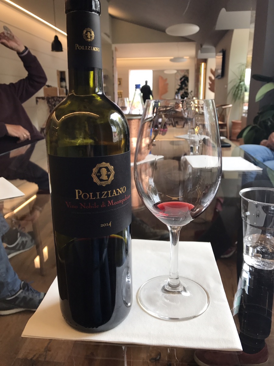 Het is eind van de ochtend en ik ben op weg naar Poliziano. Dat is niet Italiaans voor politie maar het is een wijnhuis en wel een van een hoge kwaliteit. Na een lange zoektocht en informatie van mijn gastvrouw de Engelse Laura kom ik uit bij twee totaal verschillende wijnhuizen. De eerste is dus het luxe wijnhuis Poliziano. Wij zijn met zes personen om onze mening te geven over vier wijnen. De inrichting van de wijnhuis waar we gaan proeven is strak en heel modern. Grote glazen staan al klaar en de eerste wijn wordt ingeschonken. Neus goed in het glas, draaien en dan het eerste slokje in de mond ronddraaien, eigenlijk meer kauwen. Spannend. Dit is een nog jonge wijn, lekker om te slobberen maar geen hoogdraver. Dit is een blend, een mix van verschillende soorten druiven maar we komen hier voor de topklasse en die komt dan ook. Het is de Vino Nobile di Montepulciano DOCG. Ja dat is is een hele mond vol. Dat DOCG staat voor gecontroleerd en…..gegarandeerd. Je moet je als wijnboer hier strikt houden aan allerlei regels en die worden dus gecontroleerd. Bij deze wijn krijgen we een heerlijk stukje zeer oude pecorino kaas. Een perfecte combinatie. Na deze kaas smaakt de wijn nog beter. Deze wijn ligt eerst 20 dagen in een stalen tank en dan minstens 20 maanden in een eikenhouten vat. We hebben de mazzel dat twee van onze meeproefers met de camper zijn, zij zijn zo vriendelijk mijn gekochte wijn terug naar Nederland te rijden.