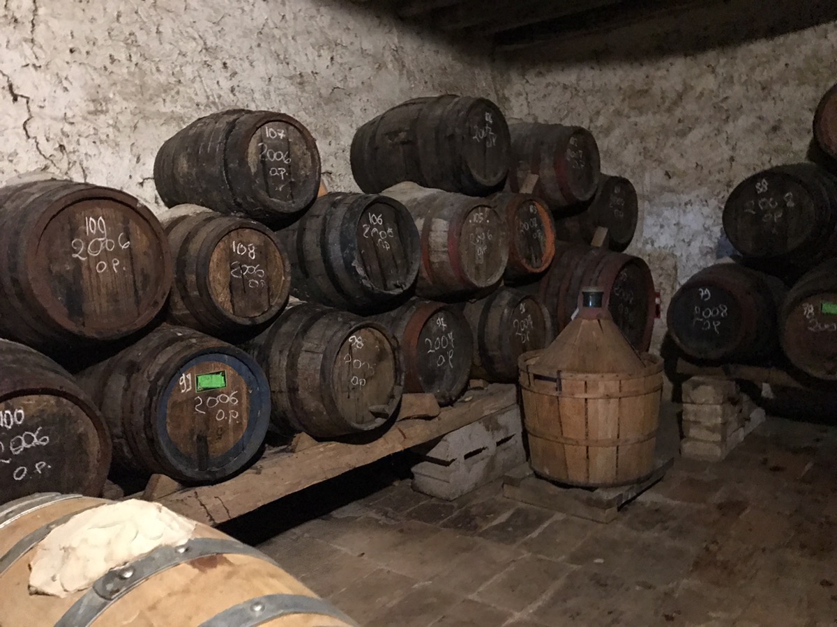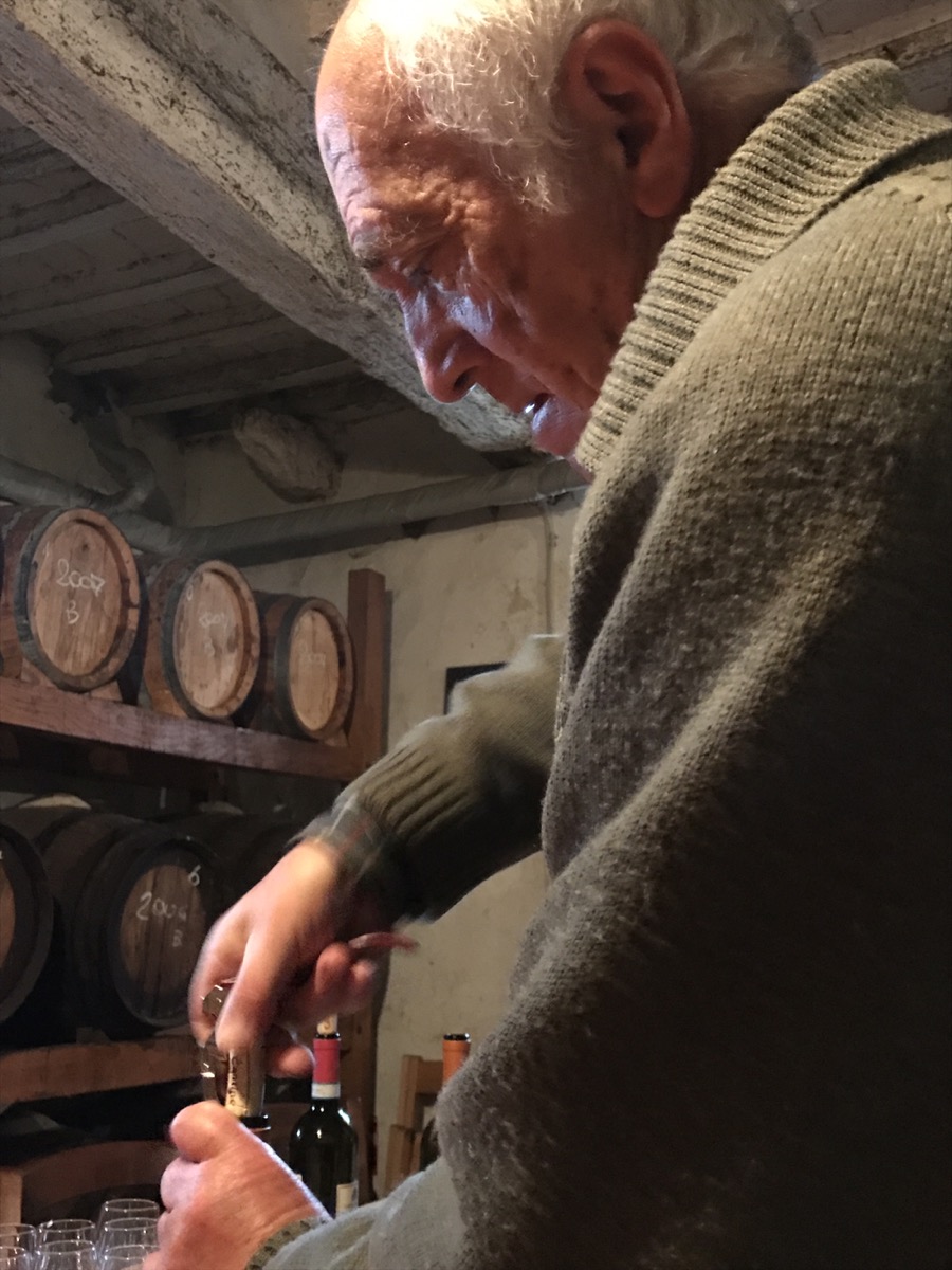 Een paar uur later ben ik in Montefollonico waar je trouwens voortreffelijk kan eten bij 13 Gobbi, een soort grote huiskamer. Bij wijnhuis Cantine Innocente worden we ontvangen door de eigenaar Victorio, verweerde bruine kop, donkere stem. Zo zie je de wijnboer voor je, die in de volle zon zijn druiven controleert, inspecteert en door zijn wijngaard loopt. Het begint al heel anders dan bij de vorige, we duiken de donkere kelder in en de grote tafel waaraan geproefd gaat worden staat tussen de diversen vaten en flessen. Op tafel een kan water en droge wat zoutige koekjes. Op zijn gemak maakt Victorio de eerste fles open en schenkt bij iedereen een half glas in. Dit is een wijn die je al in de morgen kan drinken. Eenvoudig maar toch nog wel 14%. Voor mij een wijn als ik sta te koken, gewoon in een slobberglaasje. De tweede wijn is al wat zwaarder en de derde is voortreffelijk. Vooral heerlijk bij een mooi stuk(je) vlees. Klaar? Nee. Nu komt de echte verwennerij. Twee soorten vinosanto. Zo uit het vat. Vinosanto is een dessertwijn, zoetig en deze lijkt een kruising tussen zoete sherry en port. Daar wil ik wel van beide een flesje van meenemen. Ze moeten nog op de fles maar geen probleem, Victorio komt ze morgen persoonlijk afleveren. Hoe zou het toch komen dat de dames achter de kassa in de supermarkt zo nors zijn en de mensen die in de “wijn” werken zo vrolijk?