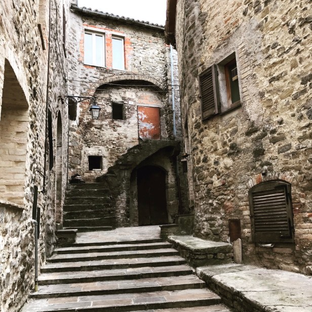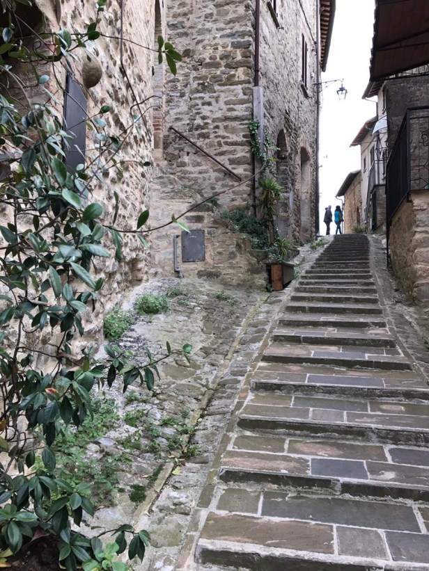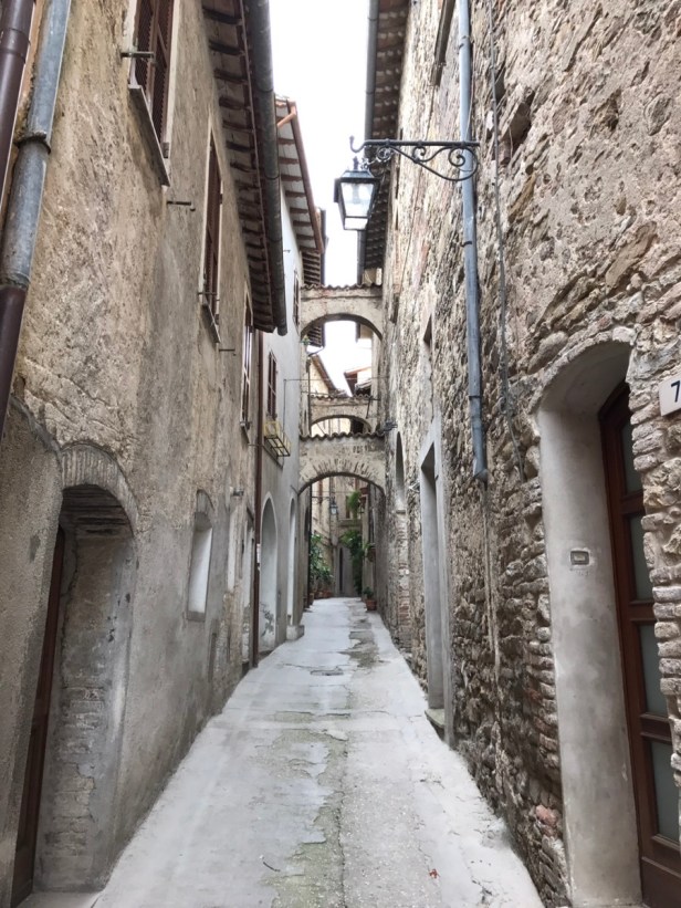 Het is inmiddels 1 mei, hier een dag die gevierd wordt. Wij gaan lopen naar Bevagna zo’n  zes km. Het is weer een oud Romeins stadje met dito kerken. Het is druk met Italiaanse dagjesmensen. Vrije dag hè. Hans heeft een reservering bij een goed restaurant gemaakt voor ons, dus daar hoeven we ons geen zorgen over te maken. We kunnen alles hier eens goed bekijken. Het stadje is nog geheel ommuurd. Ook hier weer vanaf de hoofdstraat allemaal kleine zijsteegjes met kronkels en trappen. Veel kunst in de kerken.