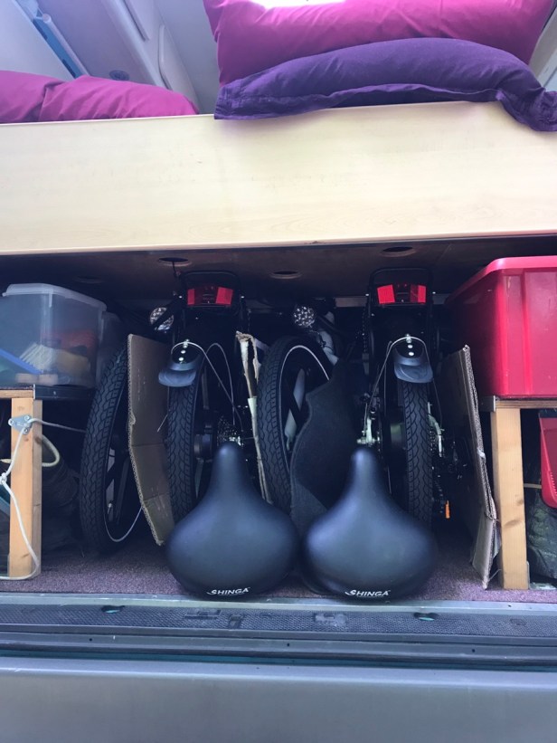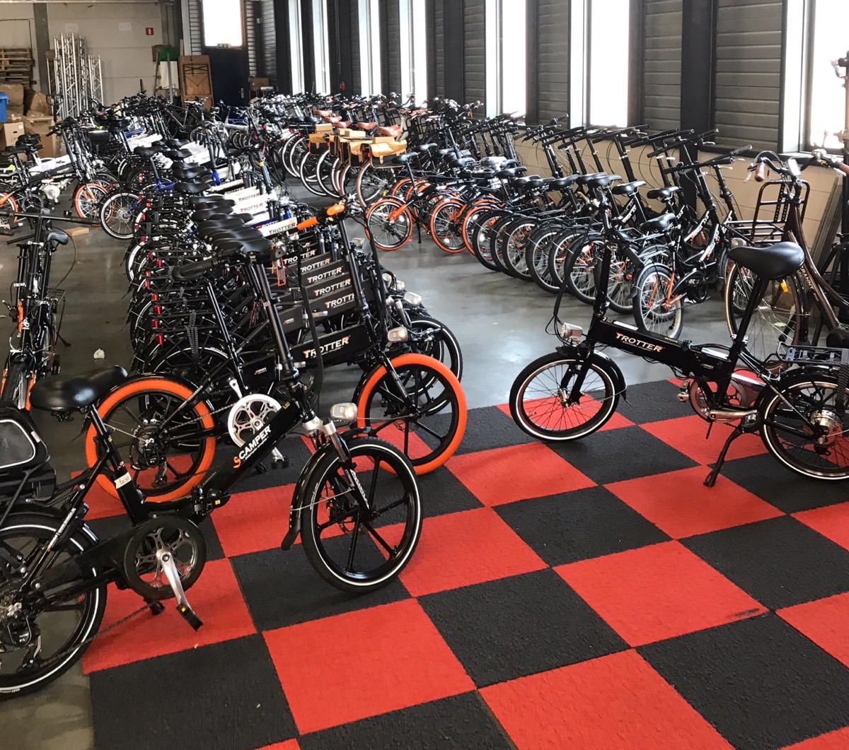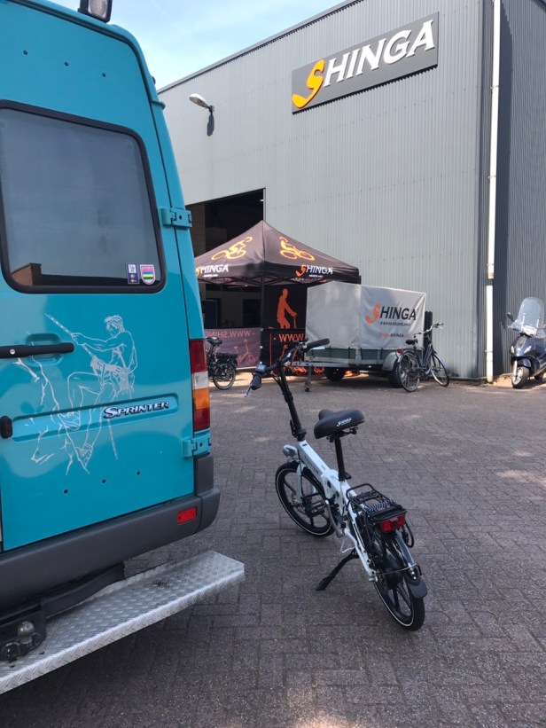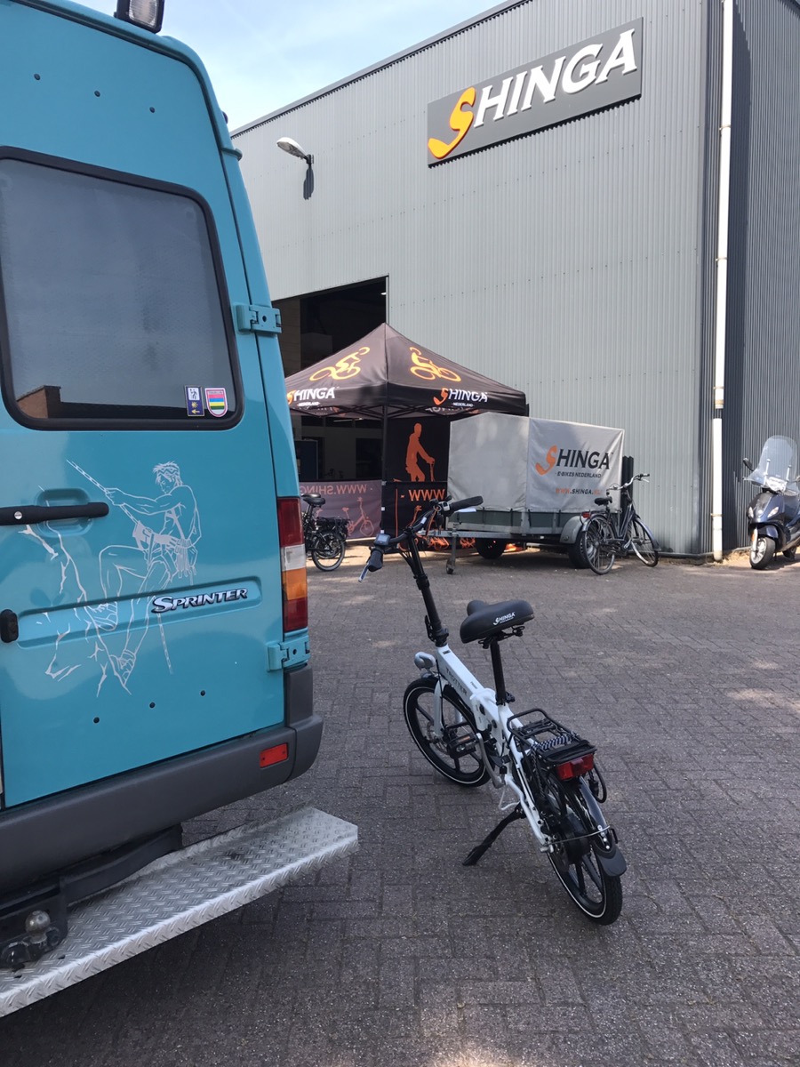 Op een camperbeurs zie ik een stand waar ze electrische vouwfietsen demonstreren. In plaats van de grote zware fietsen achterop die er eerst af moeten om de achterdeur te openen twee inklapbare gewoon achterin de Sprinter en dat niet alleen. Omdat ik begin december vertrek om een jaar door Europa* te trekken val je niet zo op als er geen fietsen achterop staan Ik ben mij er eens goed in gaan verdiepen en bij elke test blijkt de Shinga er toch wel uit te springen. Toch maar eens in het echt kijken, proefritten maken en meten of ze echt wel in Sprintertje passen. De showroom zit in Schijndel en hier staan de fietsen keurig in het gelid te wachten op zijn nieuwe baasje.