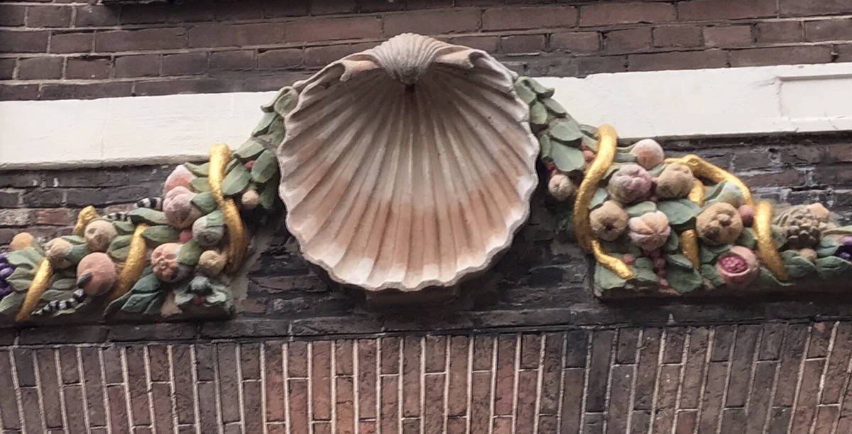 Veel kleine ambachtsbedrijfjes. Zo kom ik ook in de Hagenstraat en zie daar in de gevel een prachtige Jacobsschelp.