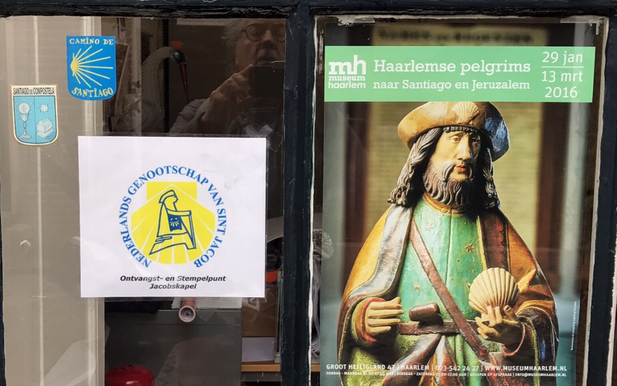 In vroeger tijden vertrokken hier de pelgrims naar Santiago de Compostela en ook nu kun je hier vertrekken en de stempel in je credential krijgen. Iets verderop vind ik de nog enig overgebleven toegangspoort van Haarlem. Deze heet dan ook de Haarlemse poort.