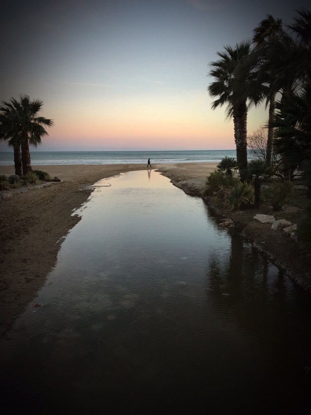 Het is tweede paasdag en de avond valt. De zon is al verdwenen. Ik sta aan het strand van Gavà. Aan de horizon vaart een giga donker containerschip. Afmeting horizontale Domtoren. Links ligt Barcelona waar net een cruiseschip is vertrokken. Een en al licht. Herinneringen schieten door mijn hoofd hoe ik als 19 jarige als kapper werkte op de SS Rotterdam. Om deze tijd begint het captains dinner en de dames moesten natuurlijk in vol ornaat en mooie gewatergolfde haartjes aan tafel. De mannen in wit smokingjasje in deze tijd niet meer voor te stellen. Ja deze gedachtes komen boven bij de lichtjes van dat cruiseschip. Na de drukte van Valencia is het weer heerlijk de rust te ervaren van een stil strand. Gisteren op een camping gestaan in Cambril.