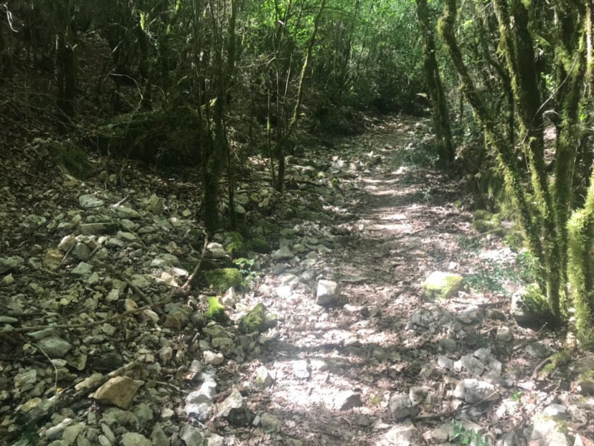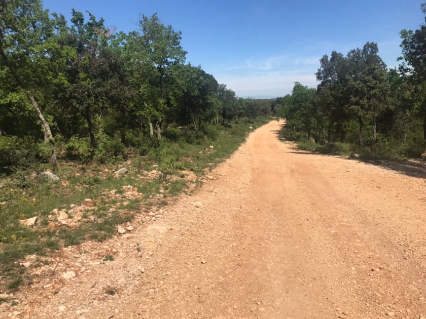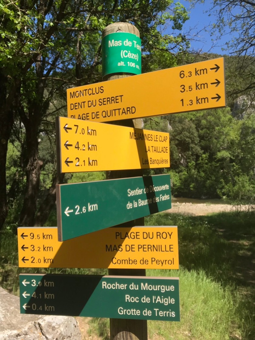 Overal van die bordjes. Alles is perfect aangegeven in dit gebied. Met een goede kaart erbij en als je niet stekeblind bent kun je niet verdwalen. Ik ga richting Montclus. Lekker een beetje schaduw en flink tempo erin. Het enige lastige van die poles is als je weer eens een foto of stukje video wil opnemen. Maar dat die ik toch regelmatig. Na enige tijd verlaat ik het makkelijk lopende verharde pad weer en duik de bush weer in. Maar eerst even een appeltje eten. Tenminste ik dacht even. Normaal eet ik een appel in een paar happen op maar nu heb ik net gelezen in De Tao van het lichaam dat je de appel helemaal moet opeten, ook het klokhuis met pitjes. Die moet je eerst goed fijnkauwen. Ik probeer het eens en ben er toch wel een kwartier mee bezig.