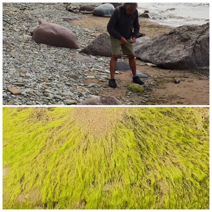 Wel helemaal al die treden af om bij het zeewater te komen. Er liggen dikke lagen stenen in verschillende kleuren en maten en alleen aan de vloedlijn is een strookje zand. Ik maak een foto van een steen begroeid met groen wier en van die actie wordt ook een foto gemaakt.
