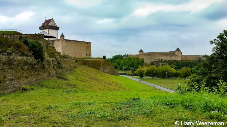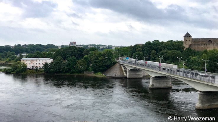 We rijden tot het einde door en gaan dan lopen. Er is een groot gebouw dat dicht getimmerd is maar we lopen er langsheen. Het voelt toch niet prettig. Een Russische patrouille boot ligt stil in het midden van de rivier. We komen bij een bordje rood omrand met een tekst erin en gaan toch maar niet verder. Iets verder aan de Estse kant staan alleen maar geraamtes van grote huizen blokken en fabrieken. We rijden er over een gatenweg heen maar ook hier bordjes met niet fotograferen en overal camera’s. Nu vind ik het wel prettig om uit mijn comfort zone te gaan maar toch maar weer braaf terug gereden naar de geasfalteerde weg en naar Narva zelf gereden waar je over een brug Rusland binnen kan. Dit is echt heel gek tenminste voor mij. Zo dicht bij elkaar en toch zover weg. Aan de Russische kant staat een groot fort en aan de Estlandse kant staat er ook een. Op beide forten staan mensen naar de andere kant te kijken.
