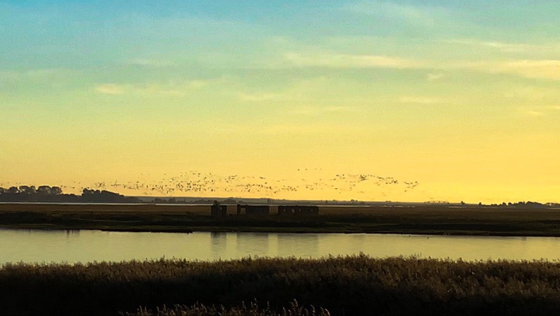 We hebben op een paar losse exemplaren na nog geen kraanvogel gezien en daarvoor zijn we hier toch. Van vriend Bart horen we dat we dan op Zingst moeten zijn. Daar rijden we naartoe. Het plaatsje op Zingst heeft dezelfde naam en we parkeren op een camperplaats bij strandafgang 6. Het is een echte surfcamperplaats, gewoon lekker rommelig. We zitten zo’n twee km van de haven en daar moet je staan om de kraanvogels te spotten. Gaan we lopen of trotteren? Het wordt trotteren oftewel met onze elektrisch ondersteunde klapfietsen, de Trotter. En daar horen we het trompetteren van de vogels al. Ze komen met honderden tegelijk en echt van alle kanten om hier aan de overkant op een veilige plek te overnachten. Overdag vliegen ze weer alle kanten op om te foerageren. Dit is eigenlijk een tussenstop op weg naar het warme zuiden. Het is wat ver om het goed te zien maar met de verrekijker is het een prachtig schouwspel. We staan op de dijk met misschien nog tien mensen te kijken naar deze voorstelling. Waar zijn al die mensen die we in de middag zagen in het stadje en op de pier? Geen interesse waarschijnlijk. Het stadje is uitgegroeid tot een behoorlijk mondaine badplaats met zeer luxe hotels en spa’s. Winkels van alle dure merken en veel eetgelegenheden. Wij genieten van de trekvogels en kijken hoe ze sierlijk landen en zijn blij dat we dit nog even hebben meegepakt. We blijven hier drie dagen en nemen afscheid van de Oostzee.
