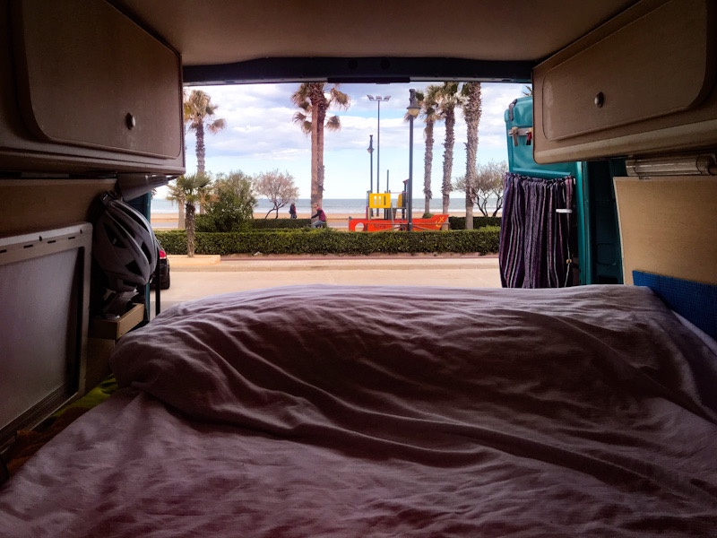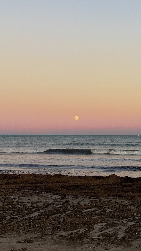 Vorig jaar heb ik twee weken wild gestaan in Valencia en dat is mij goed bevallen. Toen was ik alleen en nu met mijn lief gaan we weer naar die plek. Het is aan het strand van Malva Rosa. De plek waar we staan is precies voor de boulevard, eigenlijk meer een parkeerplaats maar we staan er met nog een paar andere campers. Uitzicht op de zee.Deze keer niet de oude stad in maar lekker stukken lopen op het strand. De buurt heet ook Malva Rosa en is een wat oudere wijk met daarachter de grote gebouwen van de Universiteit. Veel studenten hier in de wijk en dat geeft een bijzondere sfeer. Direct de eerste avond werden wij al verrast met een opkomende volle maan. Wil je nog meer romantiek? De volgende ochtend op het strand mijn oefeningen doen om een beetje soepel te blijven en douchen onder de koude buitendouche. Weer lopen, terrasje pakken om een goede cortado te drinken, lezen, fotograferen, ja zo kom ik de winter wel door. Een kijkje in de vissershaven, hier staan altijd mensen die in de rij staan om de achtergebleven vissen te kopen. We blijven drie dagen in Valencia en gaan dan weer een stukje verder.