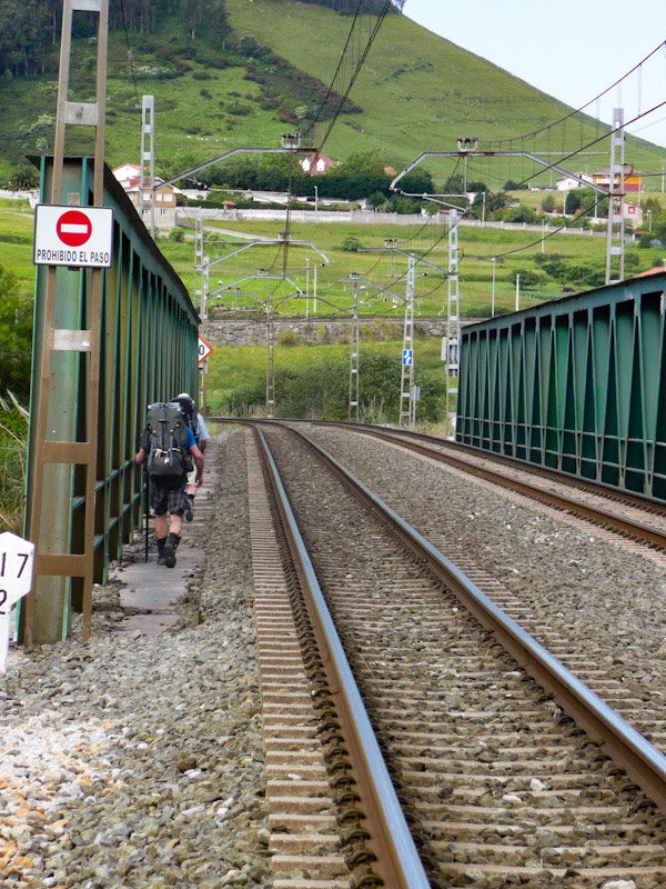 Nu is de korte route stiekem over een spoorbrug, dat ten strengste verboden is. Doe je dat niet dan moet je 10 km omlopen. Wat denk je dat we doen? De brug natuurlijk. We staan eerst een minuut of tien te twijfelen, wachten tot er een trein komt en daarna snel eroverheen. Het vervelende is dat er geen trein komt. We hebben geen dienstregeling. Er komen een paar andere pelgrims aan en die lopen zonder te aarzelen naar de overkant. Wij rennend erachteraan. Gered en geen trein gezien.