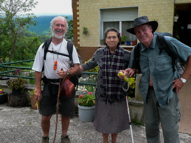 Onderweg komen we langs een oude vrouw die een tros bananen in de hand heeft. Iedere pelgrim krijgt een banaan van haar. Dat doet ze al jaren, echt zo ontzettend lief.