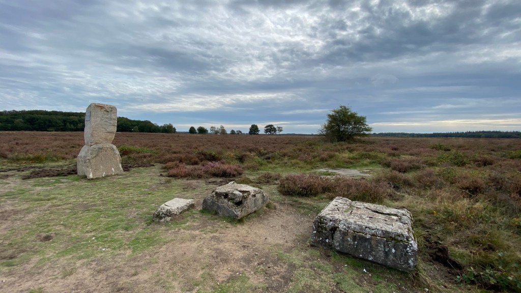 Ik passeer weer een overweg en loop het Sysseltsebos in. De weg stijgt langzaam en onderweg zie ik veel sporen van zwijnen die hier lekkere hapjes komen halen. Na zo’n 4 km is daar de Ginkelse hei. In de verte zie ik mijn tweede doel voor vandaag al opdoemen. Op dit moment is de heide bijna uitgebloeid op nog een enkel paars struikje na. Nu verwacht ik op de hei altijd stilte maar helaas de luchtmacht is aan het oefenen met helicopters, het lijkt Vietnam wel. Na 6 km sta ik op het volgende historische punt. Een punt waar echt heel veel is gebeurd.
