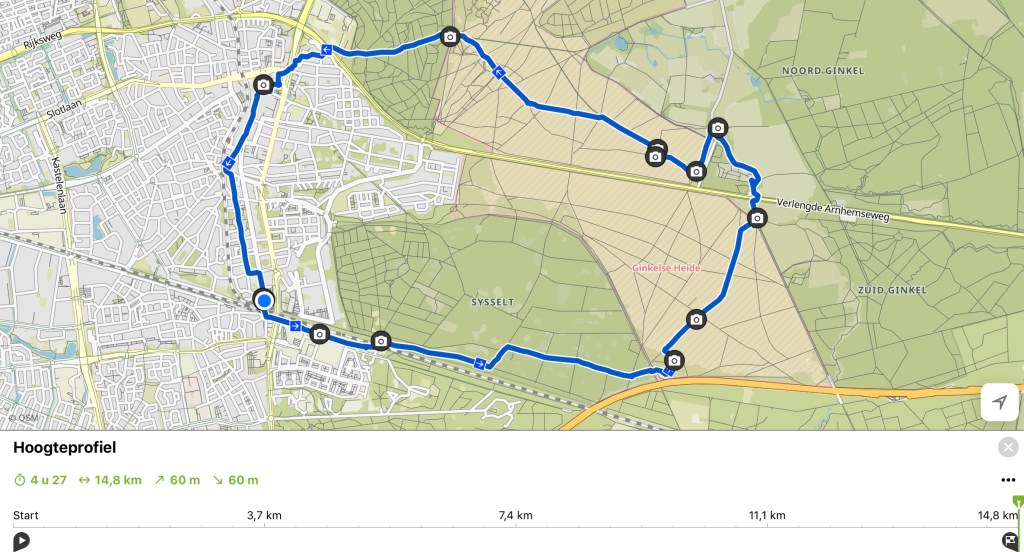 Het bos uit en het centrum van Ede in. Een kopje koffie heb ik wel verdiend, al zeg ik het zelf. Nog een kleine twee km en ik ben weer bij station Ede-Wageningen. Een rondje van 15 km langs drie historische punten. Niet helemaal waar want de Keetmolen waar ik ook nog voorbij kwam is natuurlijk ook historisch.