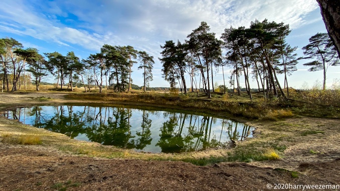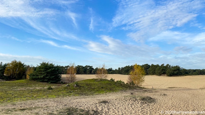 Wij liepen een rode paaltjesroute van 5,6 km. Vanaf de parkeerplaats loop je rechtuit een bosje in en dan even verderop zie je de woestijn al. Iets verder lopen en je staat in een landschap dat je nu niet direct met Nederland associeert. Ik stond even naar adem te happen, dat was niet omdat ik het lopen zo zwaar vond maar omdat ik zo onder de indruk was van deze omgeving. Het is niet alleen zand maar ook vennetjes en bos. Het is een echte belevingswandeling.
