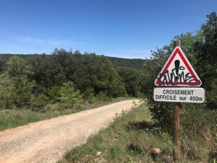 Overal van die bordjes. Alles is perfect aangegeven in dit gebied. Met een goede kaart erbij en als je niet stekeblind bent kun je niet verdwalen. Ik ga richting Montclus. Lekker een beetje schaduw en flink tempo erin. Het enige lastige van die poles is als je weer eens een foto of stukje video wil opnemen. Maar dat die ik toch regelmatig. Na enige tijd verlaat ik het makkelijk lopende verharde pad weer en duik de bush weer in. Maar eerst even een appeltje eten. Tenminste ik dacht even. Normaal eet ik een appel in een paar happen op maar nu heb ik net gelezen in De Tao van het lichaam dat je de appel helemaal moet opeten, ook het klokhuis met pitjes. Die moet je eerst goed fijnkauwen. Ik probeer het eens en ben er toch wel een kwartier mee bezig.