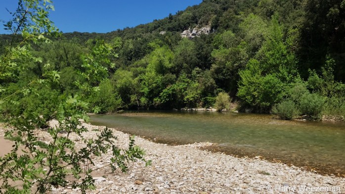Beneden kom ik uit bij de rivier. Tijd voor de banaan en een flinke slok water.