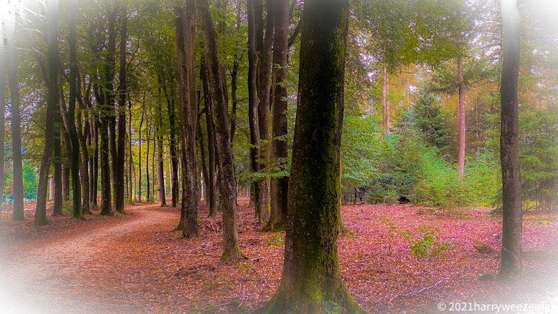 De bedoeling van de pyramide loop is om je conditie te verbeteren. Interval training. Eerst 5 minuten rustig inlopen dan 1 minuut nog even rustig en dan 1 minuut knallen, flink tempo. Ik loop met poles (nordic stokken) en mijn snelheid is dan zo’n 6,5 km. Dan twee minuten rustig en twee minuten knallen. Zo tot aan de 4 minuten tempo en dan weer afbouwen naar de onderkant van de pyramide. Heerlijk. Tijdens het uitlopen nog maar even een foto genomen van het bos dat al aardig in herfstkleuren komt.