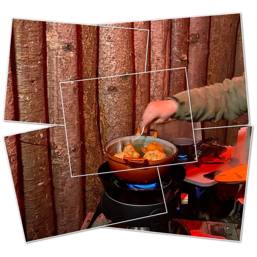 Maar dat is niet alles, deze camping heeft ook een vuurplaats. Het is een overdekte ruimte. gemaakt van houten palen met een natuur dak erop. In het midden een grote stookplaats met erboven een soort afzuigkap maar dan niet mechanisch waardoor de rook naar buiten kan. Banken om het vuur en in die ruimte gaan we oliebollen bakken. Het is nog wel geen oud en nieuw maar ook in deze tijd smaken ze uitstekend zeker als onze biobakker erbij is. eerlijk gezegd is zij ook degene die ze bakt, wij zijn meer van het consumeren.