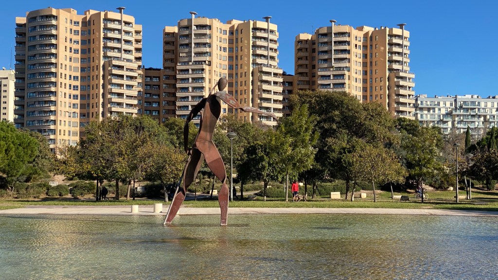 Er is hier niet veel verkeer in de nacht dus dat was lekker rustig maar de wind heeft geen boodschap aan rust. Die ging vannacht goed te keer. Toch wel goed geslapen en vanochtend volop zon. De Trotter (elektrische vouwfiets) uit het vooronder gehaald en om 10 uur al op pad. Naar het begin van de Jardin del Turia. Loop of fiets je het hele park door naar de andere kant dan zie je zeker 15000 stappen op je stappenteller staan oftewel 9 kilometer. Vorige keer heb ik dat gelopen maar dat was vanaf de camper heen en terug 29 km en dat vond ik vandaag iets te veel van het goede, zeker met die kniebanden die nog steeds niet hersteld zijn.