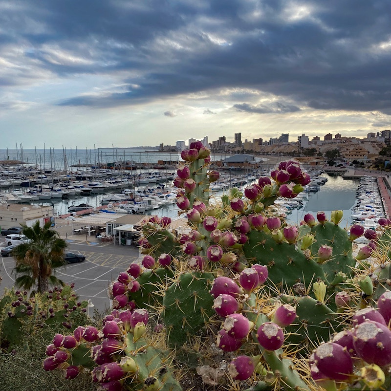We gaan verder, laten Alicante voor wat het is, nou ja omdat we zo dicht mogelijk langs de kust willen rijden moeten we wel door een druk gedeelte en langs de grote haven. We gaan nog even op zoek naar de vuurtoren en hebben vandaar een goed zicht op de baai. Het is nog vroeg anders waren we hier blijven staan om te overnachten. Goede plek om vrij te staan.