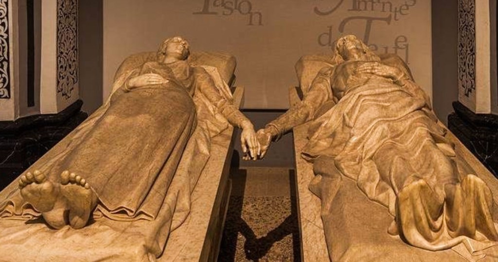 We lopen de prachtige trap, puf puf, op en staan direct in de oude stad. We treffen het, vanavond begint hier een feest. Ooit leefden hier twee verliefden. Juan Diego Martinez de Marcilla en Isabel de Segura. Diego had geen fortuin om met de rijke Isabelle te trouwen dus ging hij op reis om zo te proberen de broodnodige peseta’s bij elkaar te sprokkelen. Hij kreeg het voor elkaar en zes jaar later keerde hij vol blijde verwachting terug. Zes jaar is wel lang en daar wilde de familie van Isabelle niet op wachten. Ze was uitgehuwelijkt. Diego hoorde dit verschrikkelijke nieuws en overleed ter plekke aan één gebroken hart. Niet veel later ging ook Isabelle. Zij zag het levenloze lichaam van haar geliefde en ook haar hart begaf het. Ze hadden in die tijd ook nog geen AED’s om te reanimeren dat betekende dus einde verhaal. In het Mausoleo de los Amantes liggen de twee lichamen en twee liggende beelden die elkaars handen voor altijd vast houden.