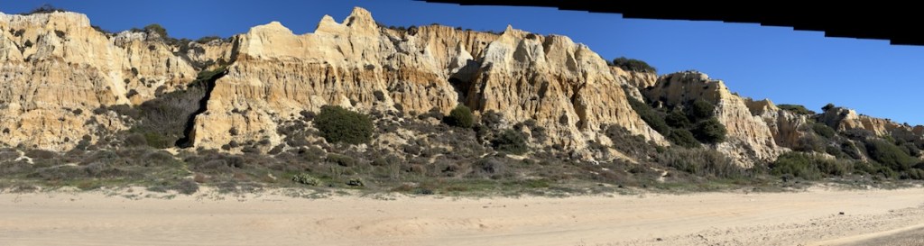 We stoppen om een boterhammetje te eten op een parking bij een strand.