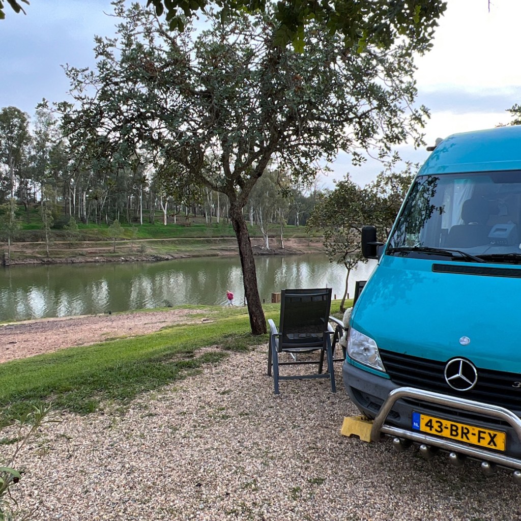 Wij vinden na dit avontuur een mooi plekje aan een meer dat niet vervuild is. Lekker de stoeltjes buiten, hier overnachten en morgenochtend poedelen in het meer. Nu staat er wel een bord dat je op deze plek zelfs niet met een camper mag stoppen maar dat geldt natuurlijk niet voor mij. Dan komt er een groepje Portugezen aan waar we een praatje mee maken. Het schijnt zo te zijn dat er echt gehandhaafd wordt. Meestal zeg ik, bij twijfel doen maar deze keer is mijn gevoel toch iets anders en we pakken de boel weer in en gaan in een straat in het dorpje staan. Toch een wat rustiger idee en nacht.