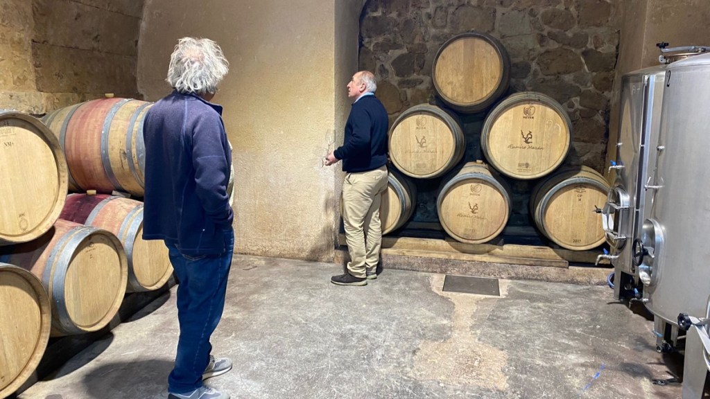Hij heeft plots alle tijd en we dalen de stijle trap af naar de kelder. Hier proeven we uit het vat, wat een prettige wijn.