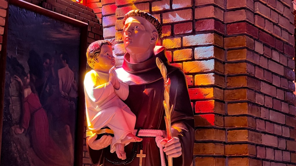 We lopen langs weer een kerk. Ga ik naar binnen? Nou nee, of toch? De deur staat uitnodigend open en wat doe je dan. Toch maar even kijken. Door de glas in lood ramen worden de beelden en muren prachtig in allerlei kleuren verlicht. Het is een voorbeeld van vakmanschap hoe de gewelven van deze kerk , de Sint Franciscuskerk, gebouwd zijn. Het heeft een bijzondere architectuur.