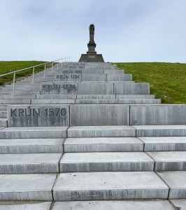 Wij rijden weer verder en parkeren op een groot parkeerterrein pal voor een grote trap waarmee je naar de bovenkant van de dijk komt.