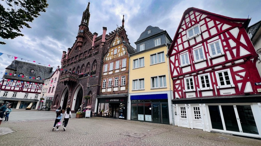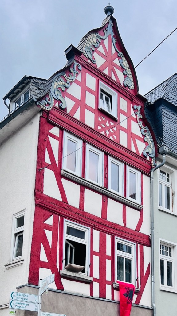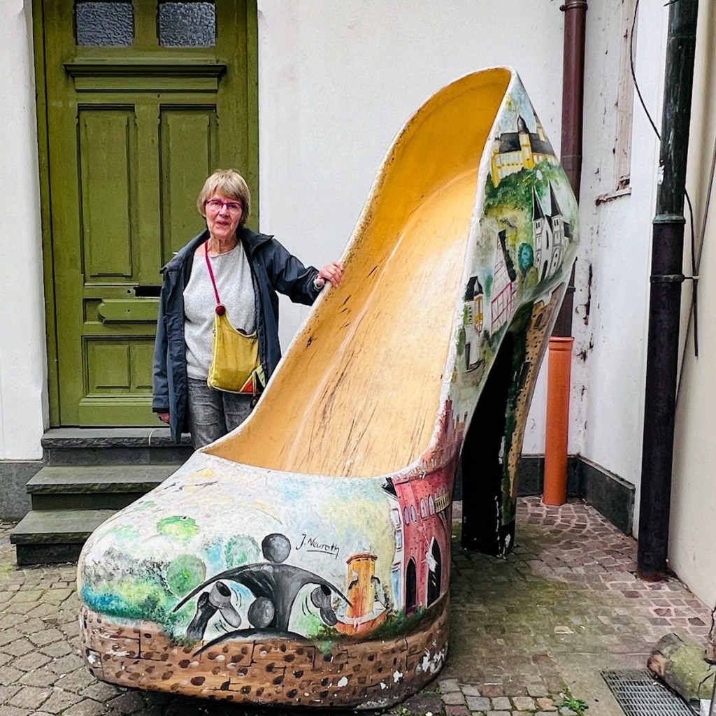 We gaan na drie en een half uur de autobahn af en vinden een vrij plekje in Montabaur op een parkeerplaats bij de brandweer en rode kruis. We kijken uit op de oude hoogstad en die is behoorlijk hoog. Via een trap en een weg waar je weer goed voelt dat je bovenbenen hebt komen we in de verrassende bovenstad. Vakwerkhuizen, gezellig sfeertje. Overal zie je grote pumps 👠 staan. Een idee van de burgemeester, volg het spoor van de stiletto hakken en je komt langs alle belangrijke punten in de stad.
