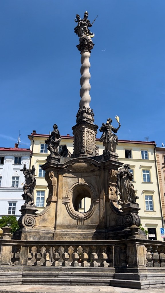 Ook op het grote plein staat een enorme zuil. De Zuil van de Heilige Drie Eenheid. 35 hoog. Het staat op de de werelderfgoedlijst van Unesco omdat er alleen maar door inwoners van Olomouc aan is gewerkt. Op dit moment is hij goed ingepakt. Hij wordt gerestaureerd en staat volledig in de steigers maar de pestzuil kunnen we wel bewonderen.