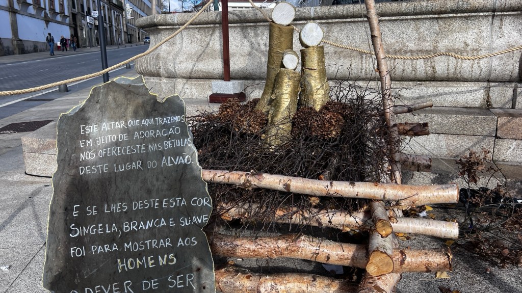 In Amerika heb je de legendarische route 66. Portugal heeft zijn route N2. In Chaves kun je bij de info een stempelkaart halen die je in diversen plaatsjes kunt laten afstempelen en een boekje met tips voor onderweg. Wij zijn niet zo van die dingen en slaan dat over. We rijden wel over die weg naar Vila Real. De naam betekent, Koninklijk dorp en dat komt omdat het onder directe koninklijke bescherming stond. Het is niet echt een dorp meer. De GPS leidt ons het centrum in en er is precies voor een kerk een plaats waar Sprintertje kan staan. Eerst maar eens koffie met een pastel de nata erbij, de Portugese lekkernij. De stad is al gereed voor de komende kerst en overal zijn kleine kerstkunstwerken te bewonderen. Ze beelden allemaal op hun eigen wijze de kerststal uit.