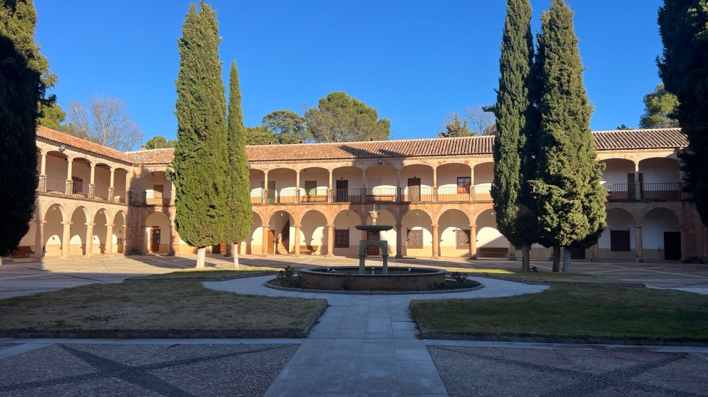 We blijven hier niet, er is een klooster in de buurt waar je goed kunt overnachten. Weer zoals we gewend zijn, een smalle weg om er te komen. Net als gisteren een plek met een gouden randje. Het klooster Convento de Santo Domingo is gebouwd in 1526. Na de secularisatie in 1844 kwam het grootste deel van het klooster in handen van de gemeente, met uitzondering van de kerk en de sacristie. Het is iedere dag geopend van 8 tot 20:00 uur. Het is nu een cultureel centrum maar nu was er niemand op uitzondering van de beheerder.