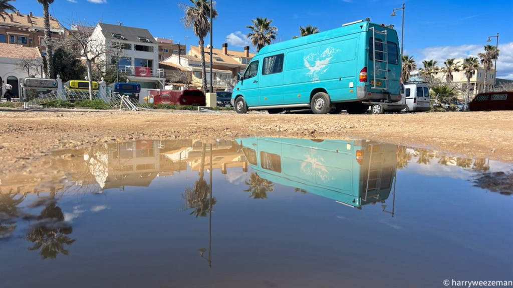 Op weg naar Valencia. De komende week zijn daar de Fallas feesten. Die wil ik graag een keer meemaken. We staan op een plek waar ik al een paar keer met plezier gestaan heb. Het strand en de wijk Malva Rosa. Strand op 50 meter en bushalte voor de deur om met de bus naar het oude centrum te gaan.