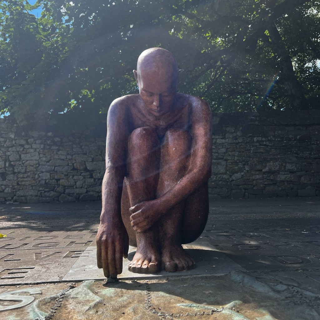 Voor de ingang van het kerkhof staat een beeld. Het stelt een naakte, gehurkte figuur voor, die met één vinger op een bronzen kaart wijst — een kaart van Ierland. De figuur straalt rust en contemplatie uit. Hij lijkt de grond, of misschien wel het land zelf, aan te raken. Veel bezoekers zien het als een symbolisch eerbetoon aan Yeats’ band met het Ierse landschap, en zijn zoektocht naar identiteit, mythe en plaats.