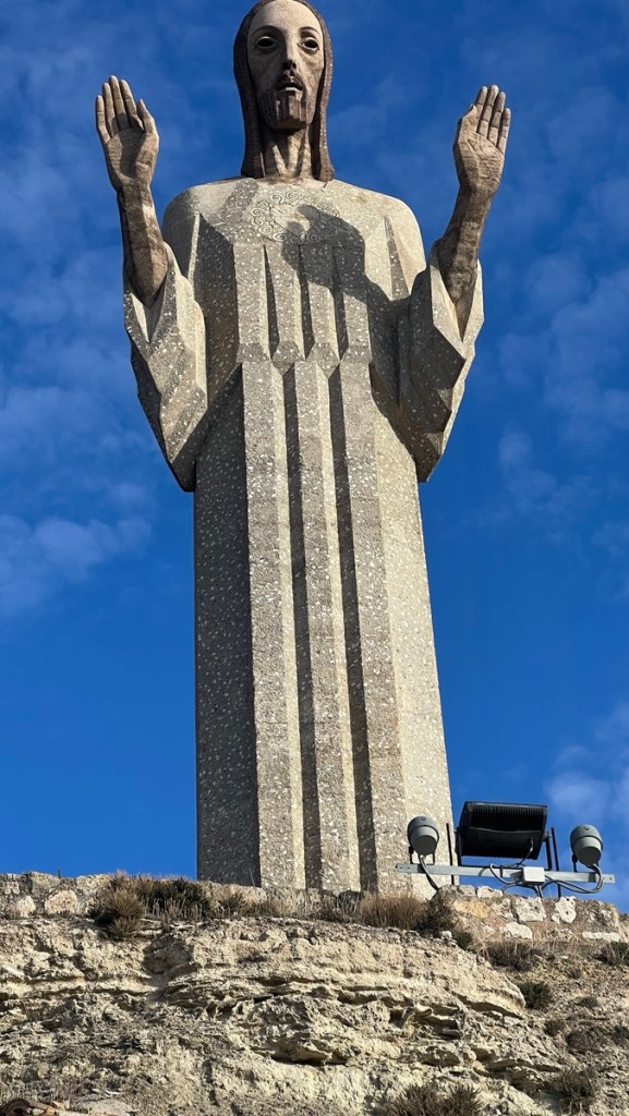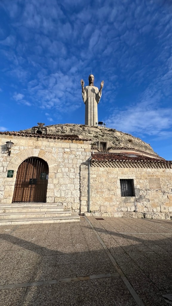 De volgende ochtend rijden we nog even de heuvel op want daar hoog boven Palencia waakt Cristo del Otero over de stad. Dit monumentale Christusbeeld werd begin jaren ’30 gebouwd door beeldhouwer Victorio Macho. Strak, sober en krachtig – geen franjes, alleen aanwezigheid. Vanaf de heuvel kijk je uit over de Meseta.
