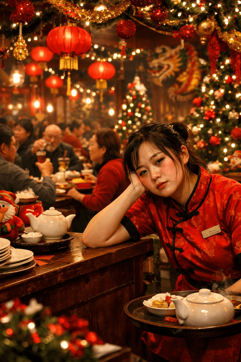 Het personeel is vrij, horen we. Alleen het eigenaarsechtpaar draait de hele avond. De man staat in de keuken, de vrouw doet de bediening. Samen runnen ze de zaak alsof het de normaalste kerstavond ter wereld is. Het is druk: een man of dertig schuift aan. Dat maakt het een avondvullend programma. Ik heb medelijden met de Chinese vrouw. Haar tong hangt nog net niet over haar schoenen.