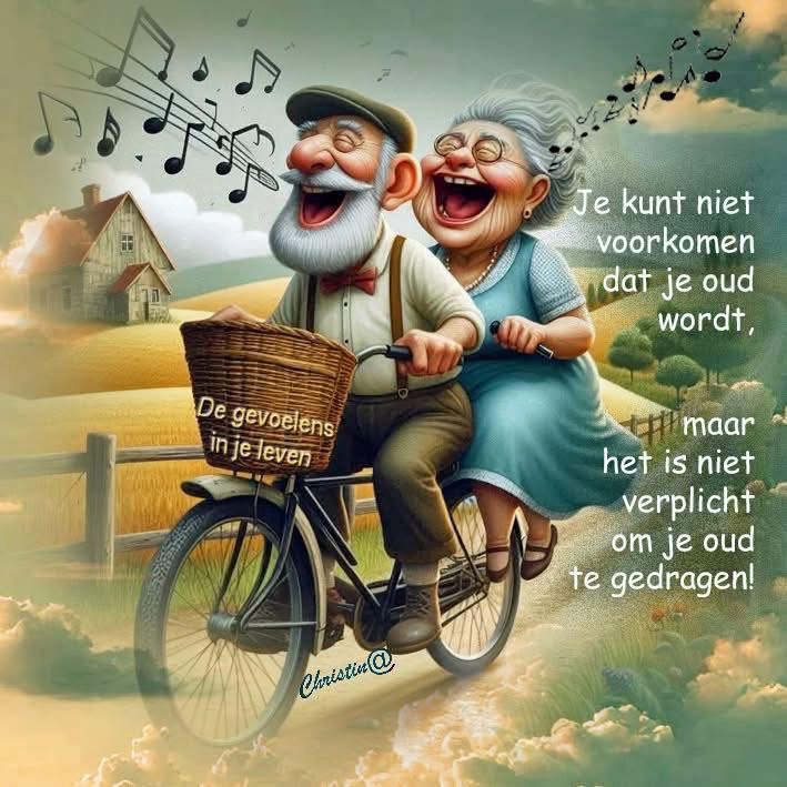Ik kwam deze afbeelding tegen van een ouder stel dat samen op een fiets zit. Ze lachen, bewegen en lijken vooral plezier te hebben. Dat is voor mij de kern.