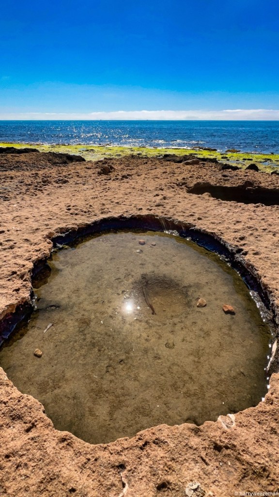 Langs het strand zien we alles wat er hoort te zijn en wat er niet hoort te liggen. Van een afstand lijkt het op een aangespoelde walvis. Dichterbij blijkt het gewoon iemand die zich laat bakken op de rotsen.